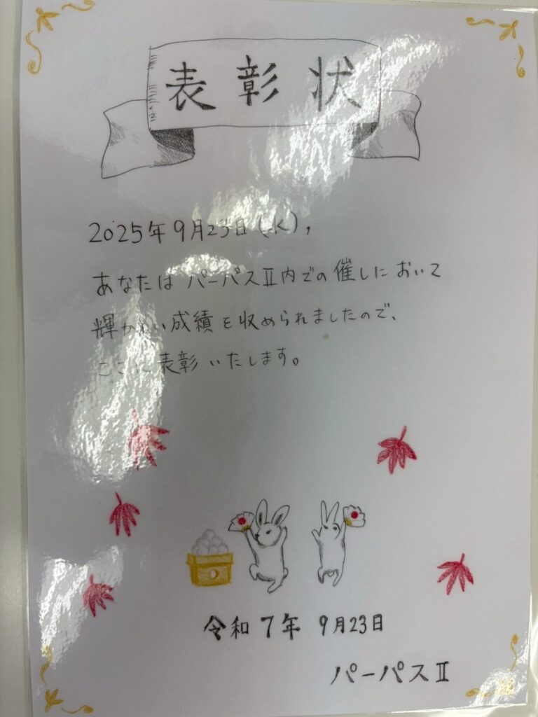 表彰状は、イラストが得意なご利用者様に作成していただきました!