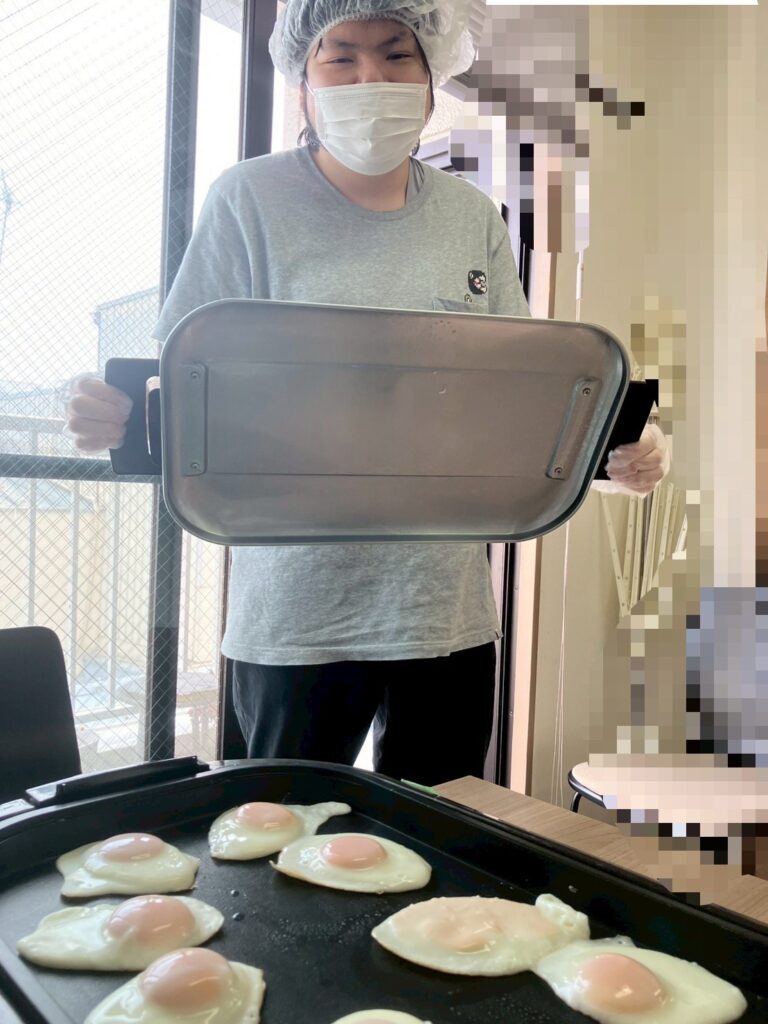 月見の主役といっても過言ではない目玉焼き🍳をホットプレートで焼いていただきました😁